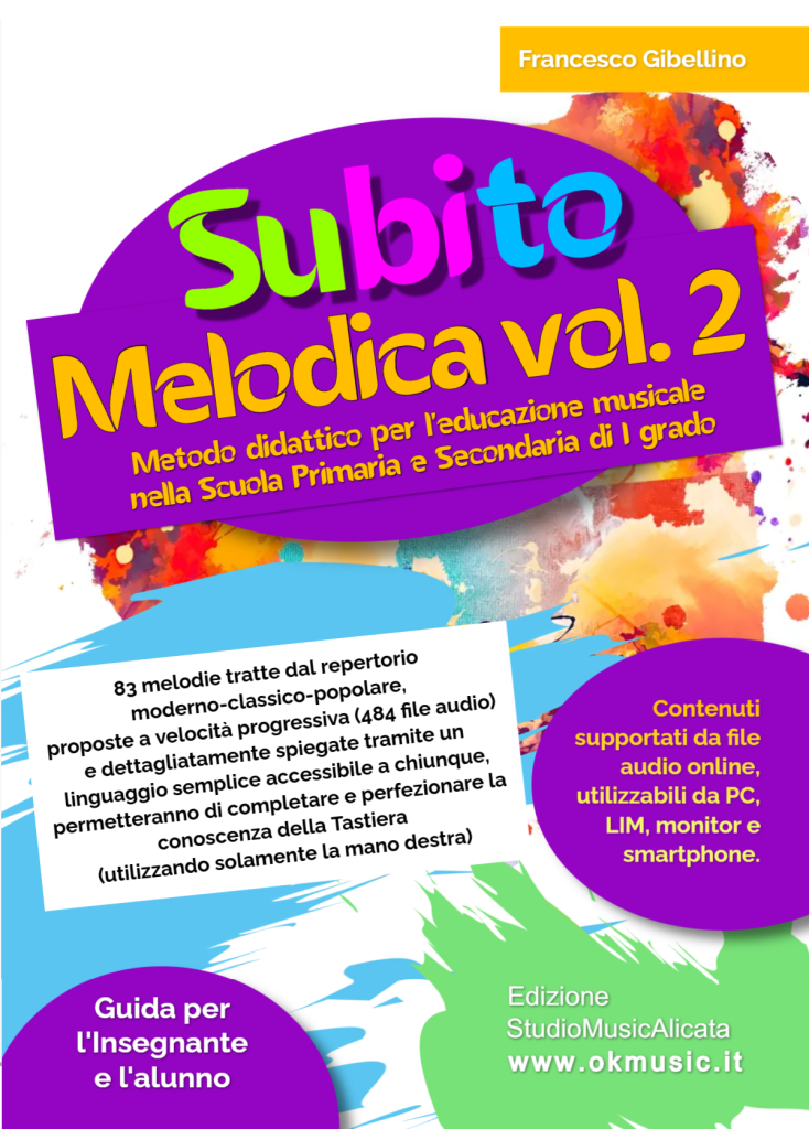 Dopo aver sperimentato i materiali gratuiti si può procedere all’acquisto del libro cartaceo Subito Melodica vol.1 o Vol.2. Il testo con copertina a colori e l’interno in bianco e nero, è disponibile al prezzo di 12,99 € e rappresenta la guida completa per insegnanti e studenti.